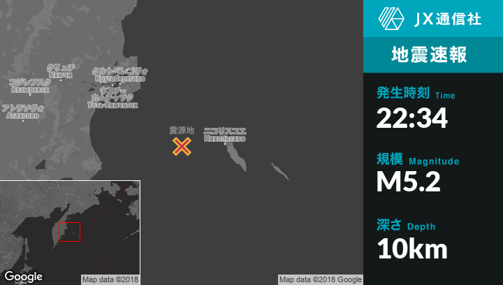 12月22日 22:34頃、ロシアのNikol'skoyeから西85kmの地点でM5.2の地震がありました。