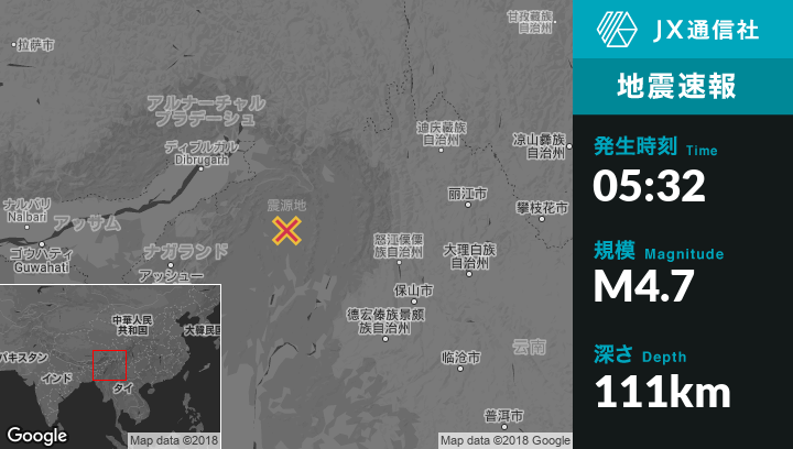 12月24日 05:32頃、インドのKhonsaから東南東119kmの地点でM4.7の地震がありました。