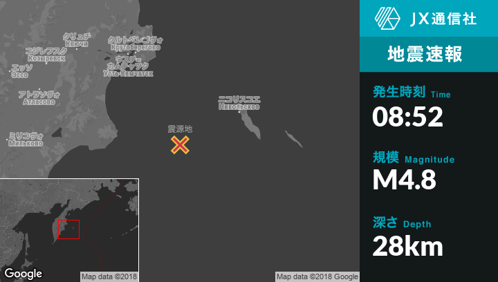12月24日 08:52頃、ロシアのNikol'skoyeから西南西133kmの地点でM4.8の地震がありました。