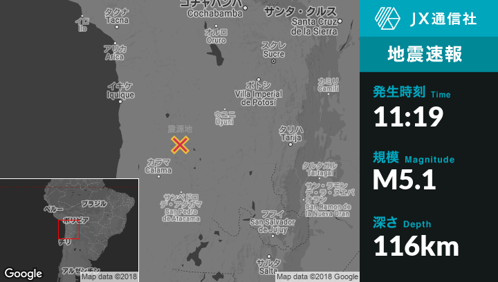 12月24日 11:19頃、チリのCalamaから北北東136kmの地点でM5.1の地震がありました。