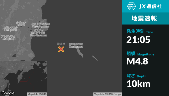 12月24日 21:05頃、ロシアのNikol'skoyeから西88kmの地点でM4.8の地震がありました。