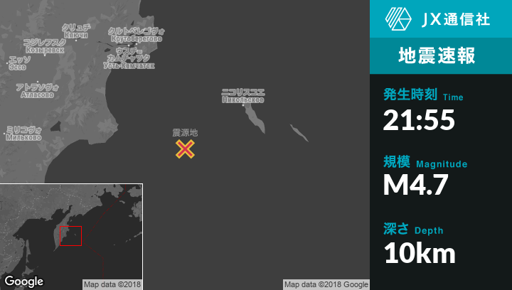 12月24日 21:55頃、ロシアのNikol'skoyeから南西139kmの地点でM4.7の地震がありました。