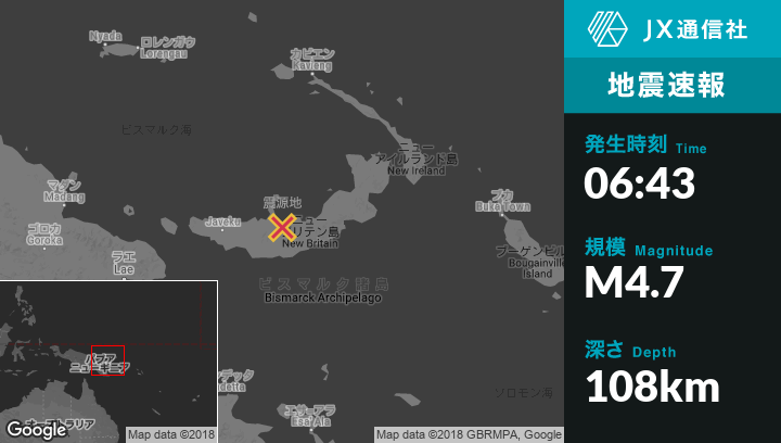 12月25日 06:43頃、パプアニューギニアのKimbeから東6kmの地点でM4.7の地震がありました。