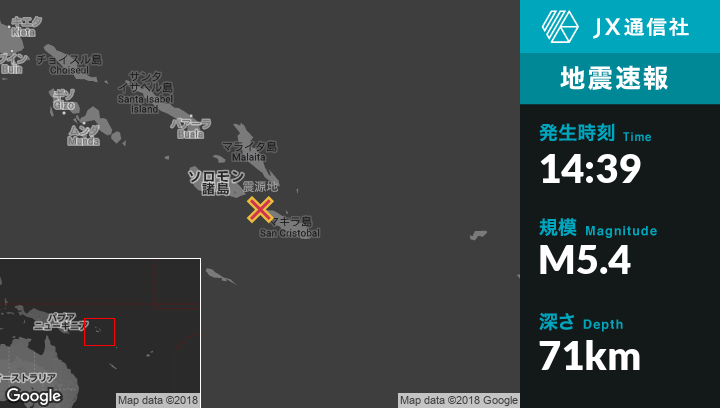 12月27日 14:39頃、ソロモン諸島のKirakiraから西北西94kmの地点でM5.4の地震がありました。