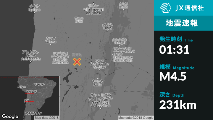 | 震源地 | アルゼンチンのSan Antonio de los Cobresから北西101kmの地点 |