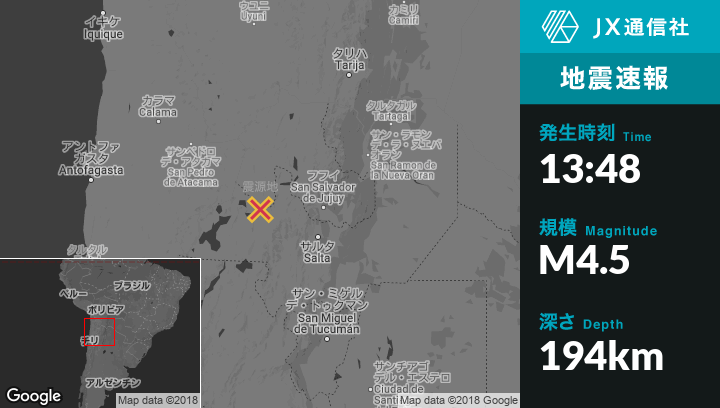 | 震源地 | アルゼンチンのSan Antonio de los Cobresから西北西37kmの地点 |