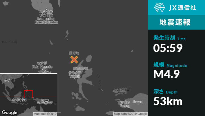 | 震源地 | インドネシアのTobeloから北西105kmの地点 |