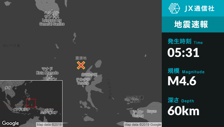 | 震源地 | インドネシアのTobeloから北西109kmの地点 |