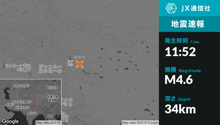 1月10日 11:52頃、インドのLehから東北東63kmの地点でM4.6の地震がありました。