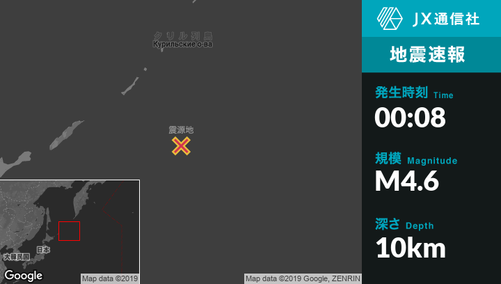 1月18日 00:08頃、ロシアのKuril'skから東451kmの地点でM4.6の地震がありました。