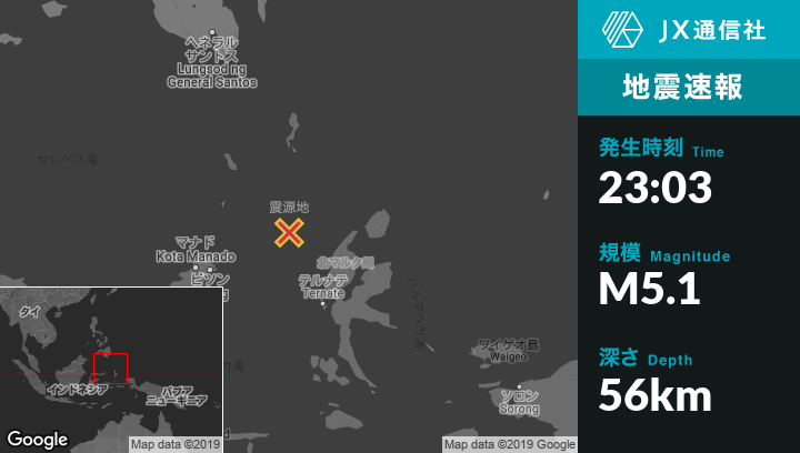 1月19日 23:03頃、インドネシアのTobeloから西北西158kmの地点でM5.1の地震がありました。