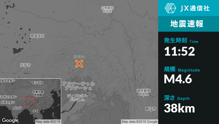 1月20日 11:52頃、中国のZhamogから西北西70kmの地点でM4.6の地震がありました。