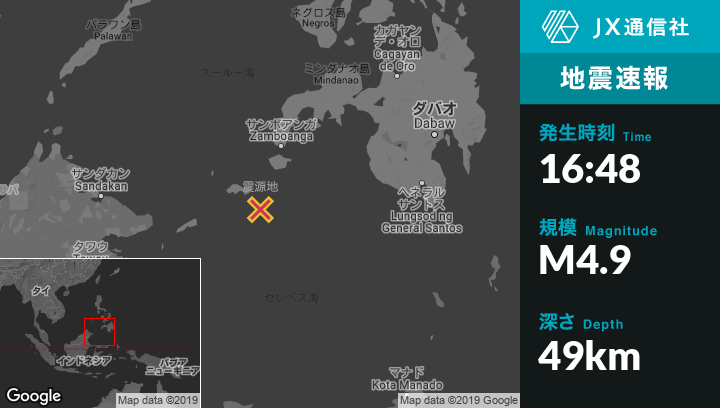 1月20日 16:48頃、フィリピンのKalangから南東41kmの地点でM4.9の地震がありました。