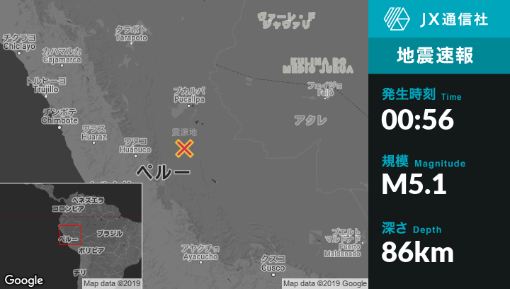 1月25日 00:56頃、ペルーのCampoverdeから南121kmの地点でM5.1の地震がありました。