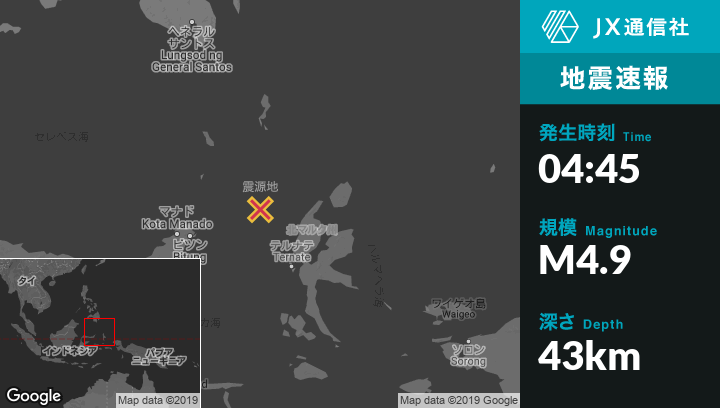| 震源地 | インドネシアのTobeloから西北西156kmの地点 |