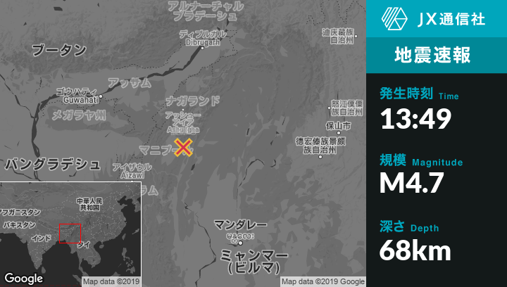 | 震源地 | インドのYairipokから東北東27kmの地点 |