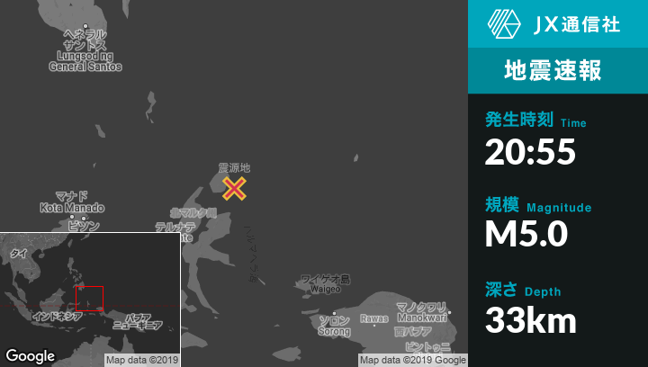 | 震源地 | インドネシアのTobeloから北東108kmの地点 |