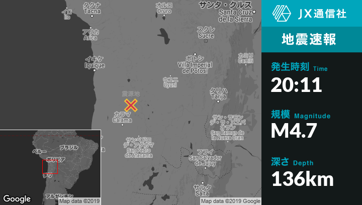 | 震源地 | チリのCalamaから北北東107kmの地点 |