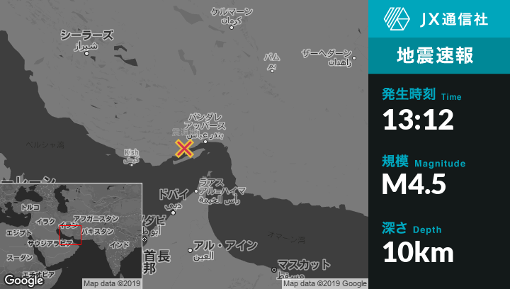 2月11日 13:12頃、イランのBandar 'Abbasから西67kmの地点でM4.5の地震がありました。