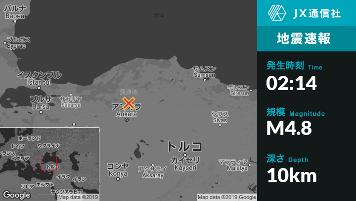 2月13日 02:14頃、トルコのOrtaから西南西14kmの地点でM4.8の地震がありました。
