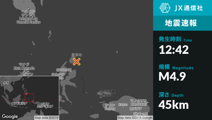 | 震源地 | インドネシアのTobeloから北東104kmの地点 |