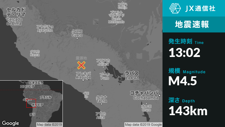 2月14日 13:02頃、ペルーのCcoloから北西32kmの地点でM4.5の地震がありました。