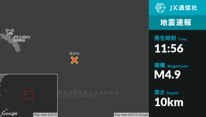 2月15日 11:56頃、サウスジョージアとサウスサンドウィッチ諸島のGrytvikenから東南東323kmの地点でM4.9の地震がありました。
