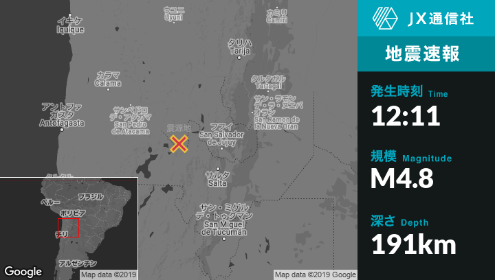 2月19日 12:11頃、アルゼンチンのSan Antonio de los Cobresから北西46kmの地点でM4.8の地震がありました。