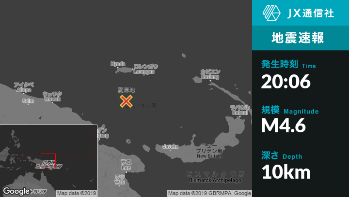 2月19日 20:06頃、パプアニューギニアのLorengauから南南西153kmの地点でM4.6の地震がありました。