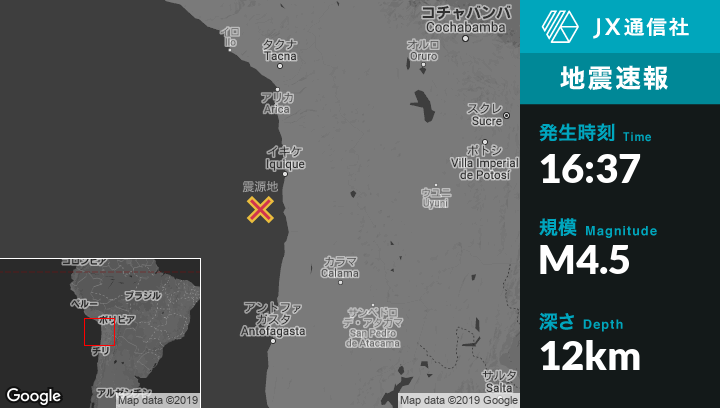 2月21日 16:37頃、チリのIquiqueから南西90kmの地点でM4.5の地震がありました。