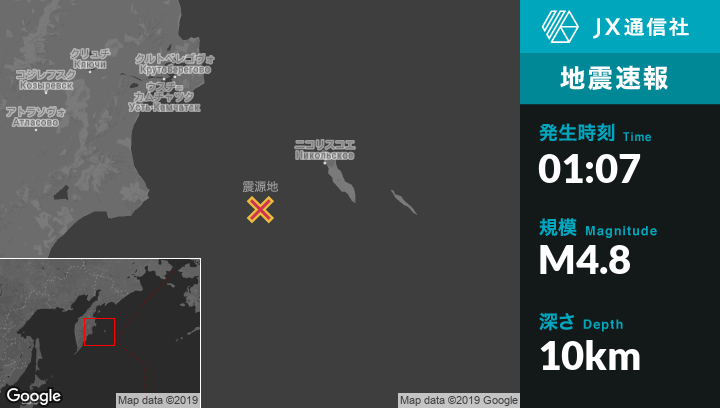 2月22日 01:07頃、ロシアのNikol'skoyeから西南西108kmの地点でM4.8の地震がありました。