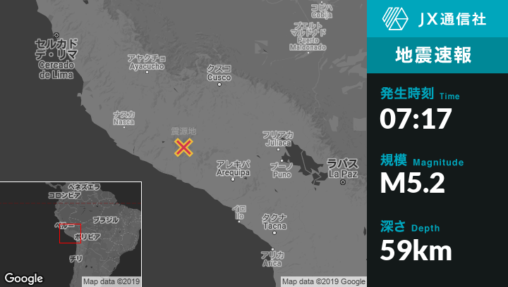 2月22日 07:17頃、ペルーのOrcopampaから西79kmの地点でM5.2の地震がありました。