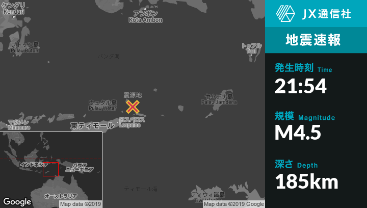 2月22日 21:54頃、東ティモールのDiliから東北東244kmの地点でM4.5の地震がありました。