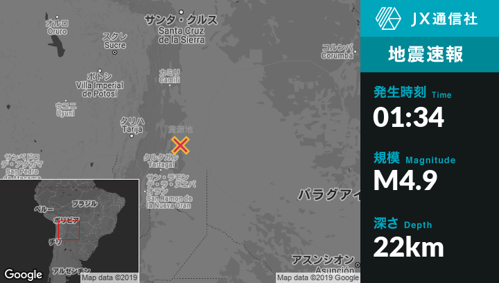 2月24日 01:34頃、ボリビアのVillamontesから南南東57kmの地点でM4.9の地震がありました。