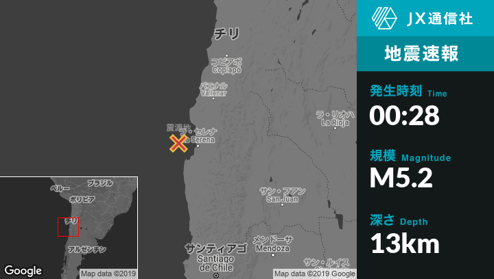 2月26日 00:28頃、チリのCoquimboから西北西56kmの地点でM5.2の地震がありました。