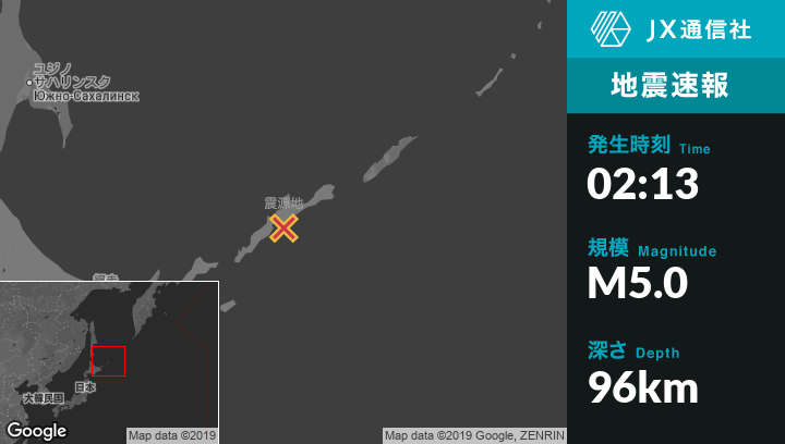 2月26日 02:13頃、ロシアのKuril'skから南23kmの地点でM5.0の地震がありました。