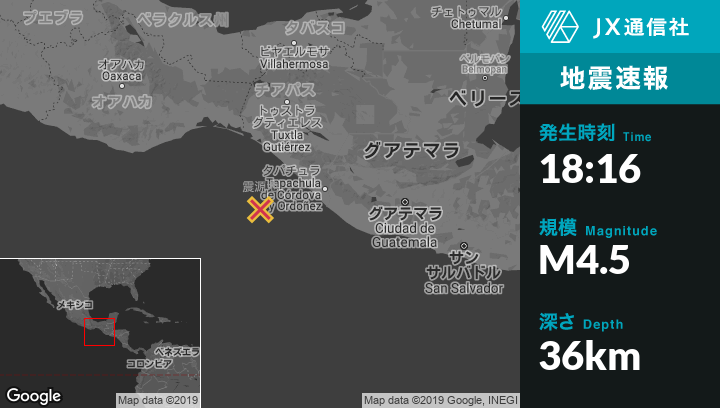 2月27日 18:16頃、メキシコのMapastepecから南西126kmの地点でM4.5の地震がありました。