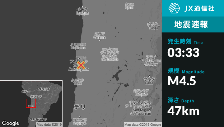 3月31日 03:33頃、チリのAntofagastaから南南東37kmの地点でM4.5の地震がありました。