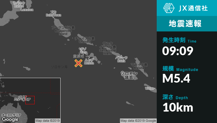 震源地ソロモン諸島のGizoから南西66kmの地点