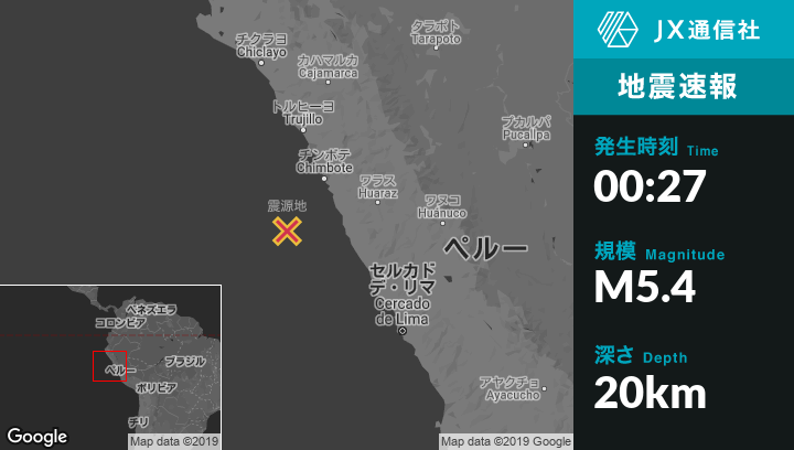 4月01日 00:27頃、ペルーのChimboteから南西129kmの地点でM5.4の地震がありました。