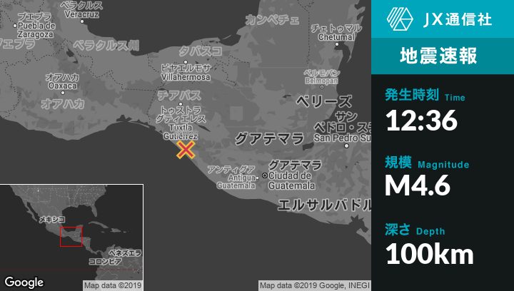 4月01日 12:36頃、メキシコのMapastepecから北北西11kmの地点でM4.6の地震がありました。