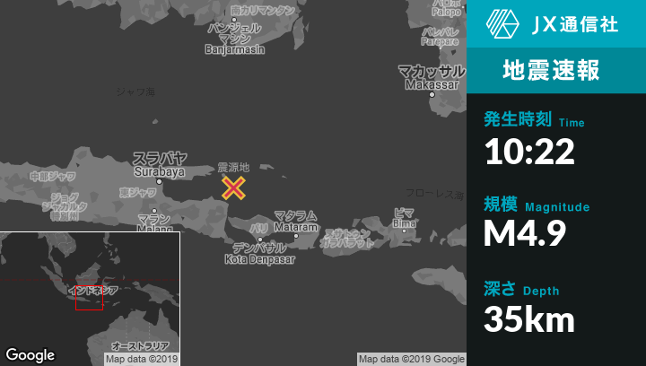 4月02日 10:22頃、インドネシアのSumberanyarから北北東61kmの地点でM4.9の地震がありました。