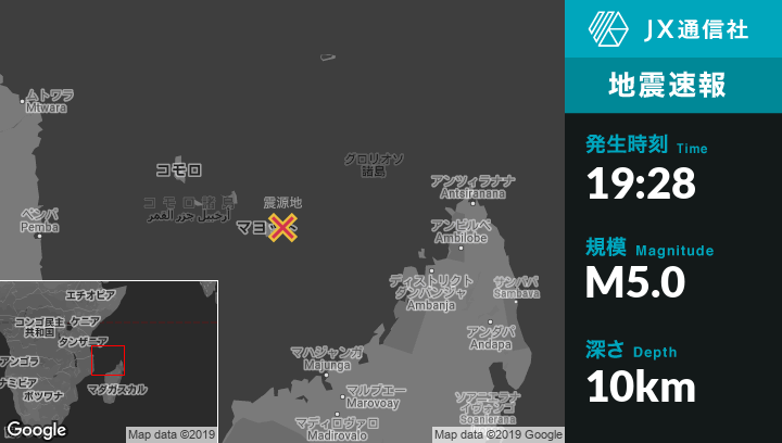 | 震源地 | マヨットのPamandziから東北東20kmの地点 |