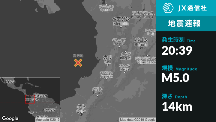 | 震源地 | コロンビアのMosqueraから北北西139kmの地点 |