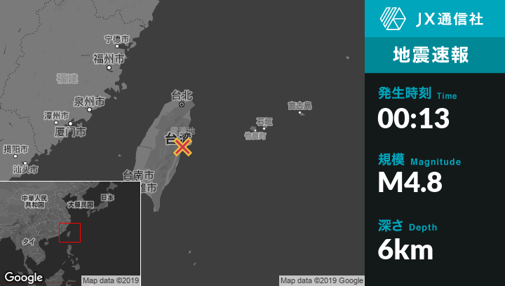 4月10日 00:13頃、台湾のHualianから南6kmの地点でM4.8の地震がありました。