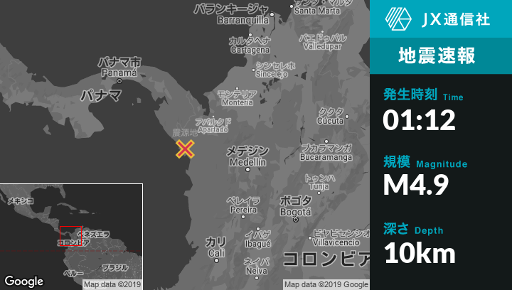 5月25日 01:12頃、コロンビアのJuradoから東南東30kmの地点でM4.9の地震がありました。