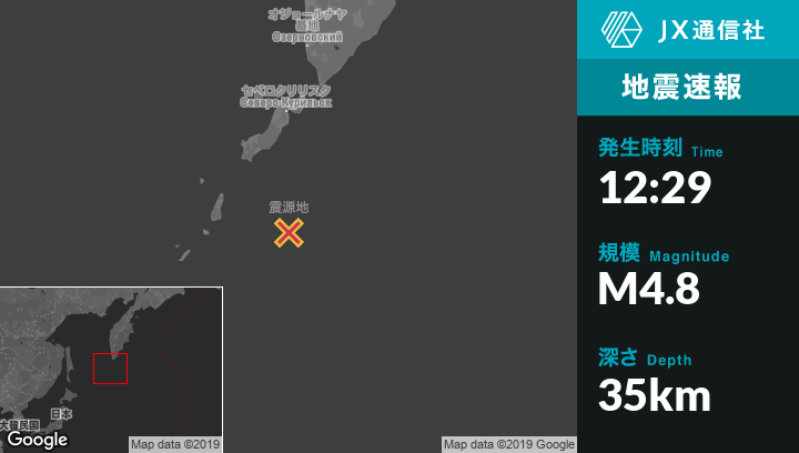 5月25日 12:29頃、ロシアのSevero-Kuril'skから南164kmの地点でM4.8の地震がありました。