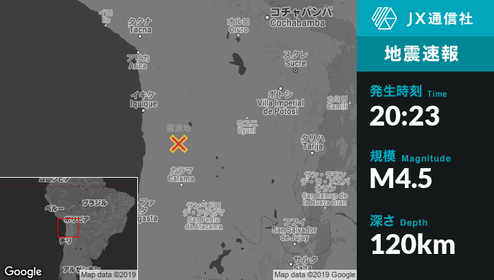 5月25日 20:23頃、チリのCalamaから北149kmの地点でM4.5の地震がありました。