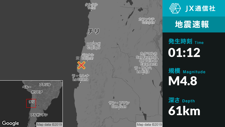 6月14日 01:12頃、チリのVallenarから西南西45kmの地点でM4.8の地震がありました。