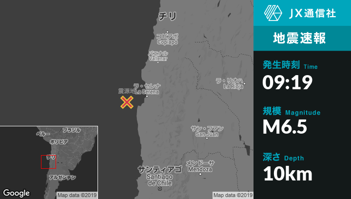 | 震源地 | チリのCoquimboから西79kmの地点 |